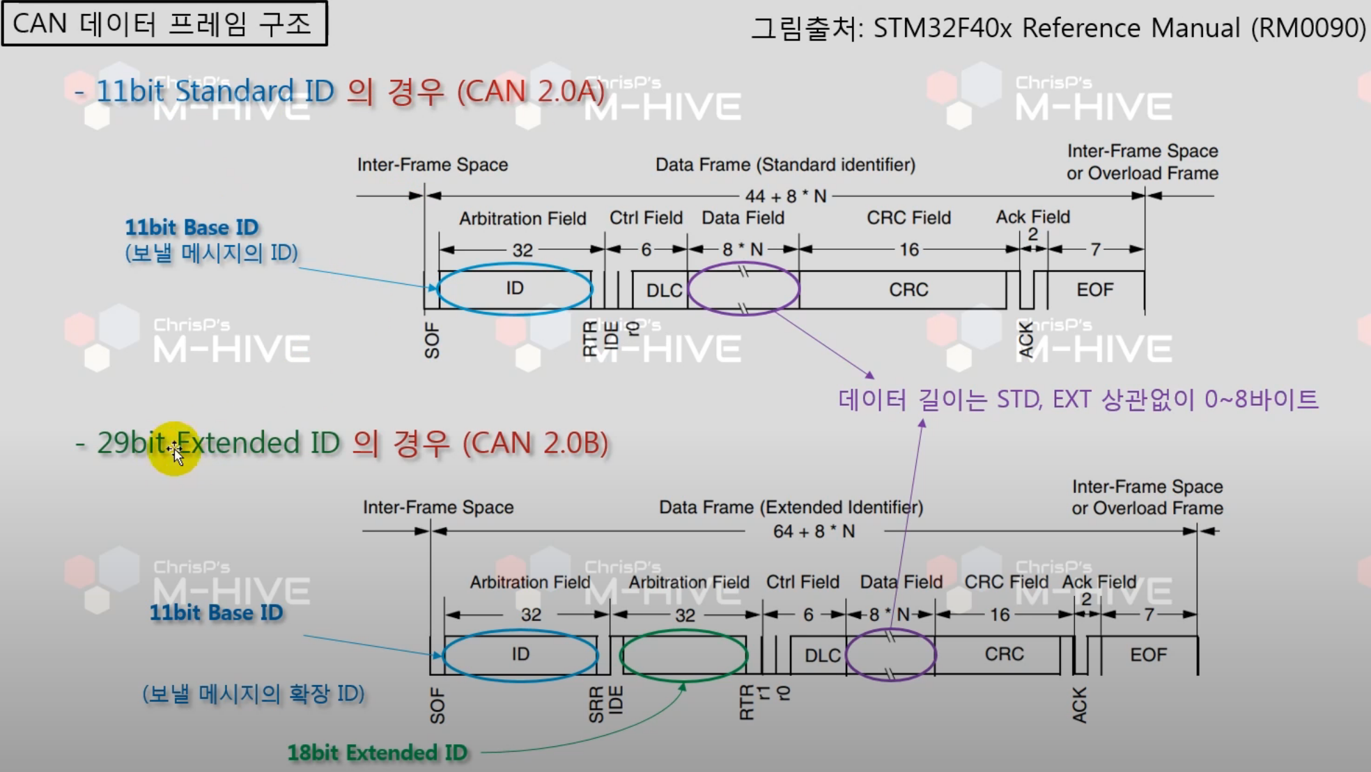 - CAN 2.0 A는 Standard ID가 11bits 이며 CAN 2.0 B는 Extend ID가 29bits 로 구성되어 있음